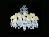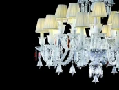 Хрустальная люстра Baccarat из коллекции Moollona с текстильными абажурами белого цвета на матовых чашках. Прозрачные хрустальные элементы чередуются с матовыми, а дополняют композицию красные подвески. Расположенные на разных уровнях лампы придадут помещению объемное освещение. Люстра 20-ти рожковая на металлической хромированной арматуре в стеклянном обрамлении. Высота светильника регулируется за счет звеньев цепи.
