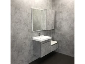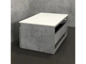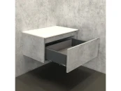 Подвесная тумба с одним выкатным ящиком. Направляющие ящика оборудованы механизмами плавного закрывания. Верхняя часть тумбы закрыта столешницей из белого керамогранита. Корпус и фасады из влагостойкого ЛДСП с декором бетон светлый.