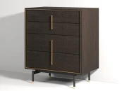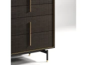 Коллекция мебели в стиле minimaluxe. Чистота линий и пропорций дополнена роскошными фактурами 3D дуба в благородном темно-кофейном оттенке и декоративной фурнитурой из латуни, выполненной по авторским экизам.Материалы: корпус и фасады - МДФ, 3D шпон дуба, полуглянцевый кофейный лак; ящики - МДФ, шпон ясеня, кофейное минеральное масло; декоративная фурнитура - латунь. Фурнитура - направляющие скрытого типа с доводчиками.Конфигурация: 4 ящика.Изделие поставляется в собранном виде.