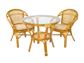 Очень удобный и красивый обеденный комплект с ажурным плетением. В комплектацию входят мягкие подушки для кресел, ткань рогожка. Стекло диаметром 83 см крепится на силиконовые присоски. Состав комплекта: – обеденный стол 1 шт. – кресла 2 шт. Комплект можно сформировать комплект на 4-х.