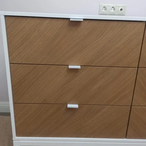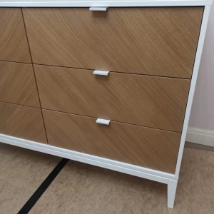 Отличительной особенностью коллекции Fjord является использование эксклюзивной «рубашки» из шпона дуба с рисунком «елочка» Смотрится очень стильно и фактурно. У комода прочный каркас из массива бука, корпус из безопасного мдф под эмалью, фасады тонированный шпон дуба Шесть вместительных ящиков на бесшумных направляющих с доводчиками. Дополнительно можно заказать раскладную пеленальную доску. Доска надежно крепится к комоду, при этом не портит его поверхности.