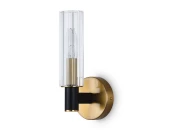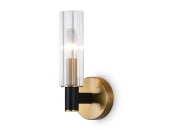 Арматура из металла сочетает два оттенка: черный и латунь. Плафоны цилиндрической формы выполнены из рельефного прозрачного стекла. Актуальная геометрия с настроением американской классики. Источник света – лампа с цоколем E14.