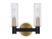 Арматура из металла сочетает два оттенка: черный и латунь. Плафоны цилиндрической формы выполнены из рельефного прозрачного стекла. Актуальная геометрия с настроением американской классики. Источник света – лампа с цоколем E14.