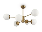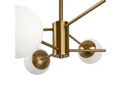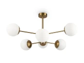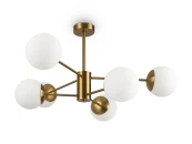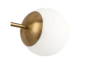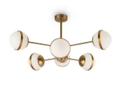 Материал арматуры – металл, цвет – латунь. Плафоны из матового белого стекла. Декор плафонов – металлический кант в тон арматуре. Оригинальная геометрия в дизайне создает динамичный образ. Источник света – лампа с цоколем Е27.