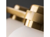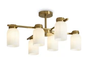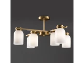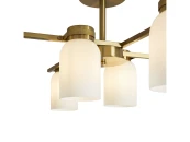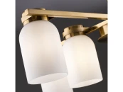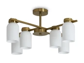 Арматура из металла. Цвет латунь. Плафоны из белого стекла новой необычной формы. Два варианта светильников — потолочные и бра. Подходит для помещений с низкими потолками. Источник света — лампа. Цоколь E14.