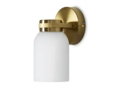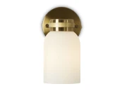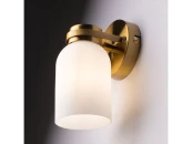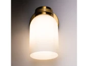 Арматура из металла. Цвет латунь. Плафоны из белого стекла новой необычной формы. Два варианта светильников — потолочные и бра. Подходит для помещений с низкими потолками. Источник света — лампа. Цоколь E14.