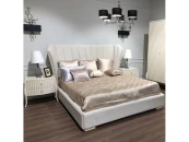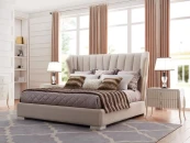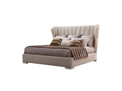 На фото в другой ткани. Кровать выполнена в стиле Ар деко. Сделана из высококачественного МДФ высокой плотности и массива дерева. Ножки в отделке матовый бежевый лак.Поставляется с решеткой, без матраса. Размер спального места 180*200 см.Комплектуется решеткой производства России.