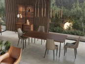 Обеденный стол изготовлен из высококачественного шпонированного МДФ высокой плотности. Металлические ножки с латунными колпачками подчеркивают изысканность модели.