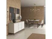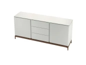 Буфет с двумя дверками и тремя выдвижными ящиками выполнен из высококачественного сертифицированного МДФ высокой прочности. Топ и корпус в отделке матовый лак, основание и ножки шпон. Ящики снабжены системой открывания push to open.