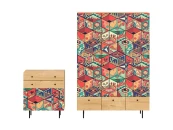 Их можно использовать в качестве систем хранения, элементов для зонирования, фокусных точек. В дизайне ярко выражена доминанта прямых форм, графичности, лаконичных линий и элегантного исполнения. Что даёт пространству ощущение размеренности, сбалансированности, упорядоченности. Подходят интерьерам как с нейтральной базой, так и локациям с интенсивными цветовыми блоками. Индивидуальности добавят модели с оригинальными паттернами на фасадах. Предметы коллекции Frida гармонично впишутся в эклектичные и стилизованные интерьеры.