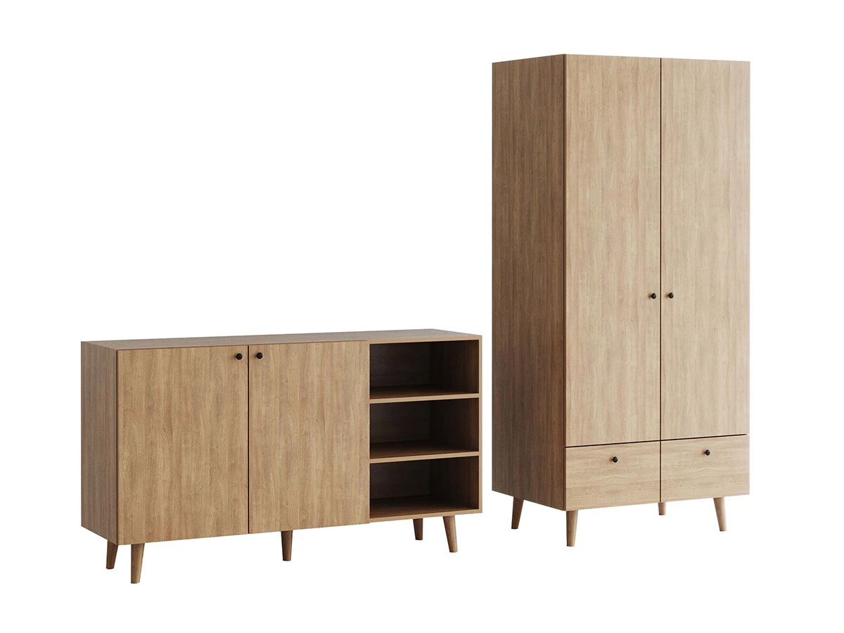 Корпусная мебель, с которой можно составить множество решений для гостиной, детской, кухни, спальни, прихожей, рабочей зоны. Комоды, шкафы, тумбы, столы, витрины, полки, серванты характеризуются универсальностью, многозадачностью, надёжными устойчивыми конструкциями. Имеют выразительный внешний вид, вдохновленный направлением ретро. Смотрятся легко и воздушно за счет деревянных ножек, минимального количества декоративных элементов, спокойных природных оттенков.