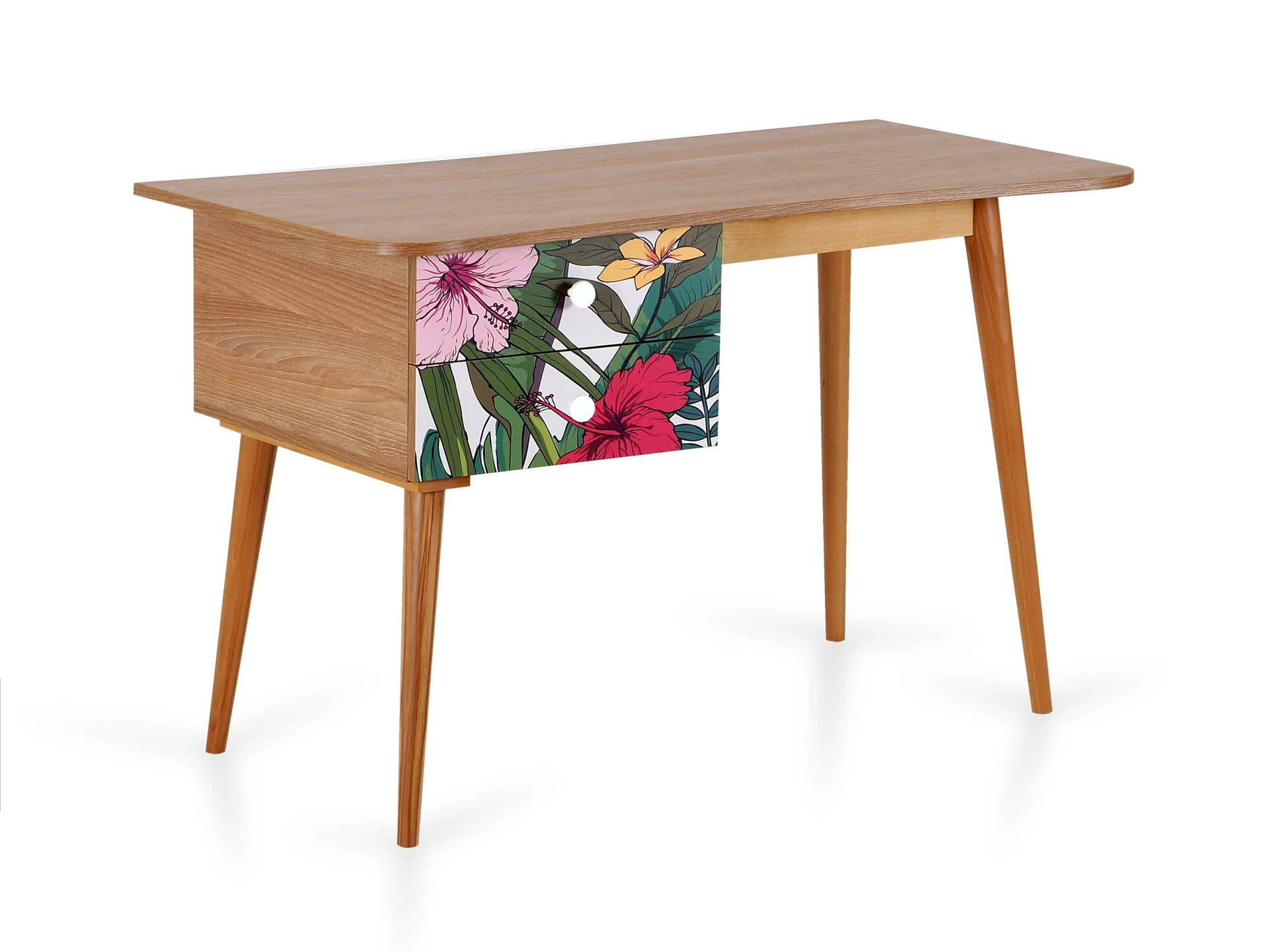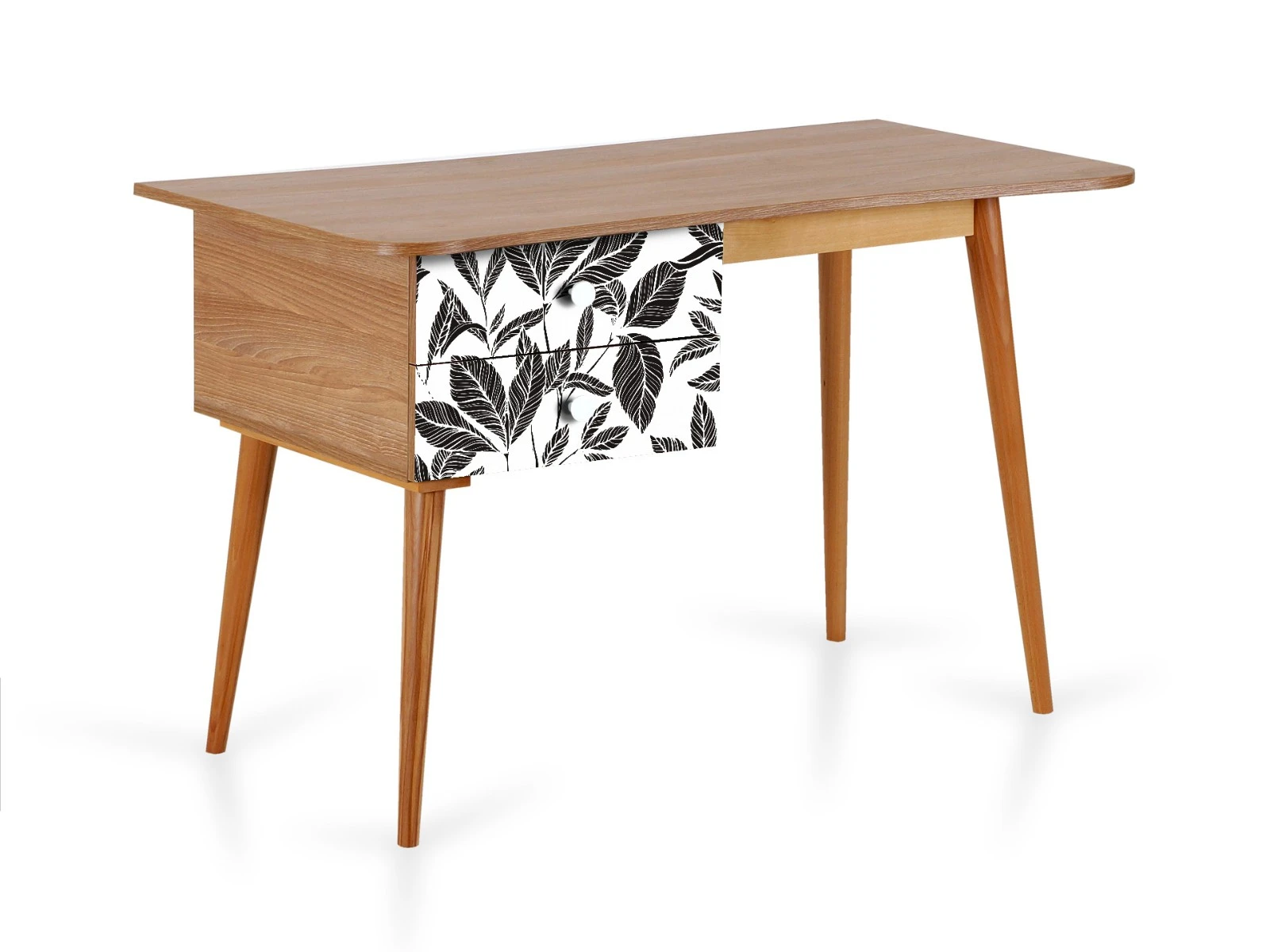 В столе два ящика на скрытых направляющих. В нижней части основания установлена полка.