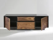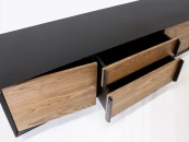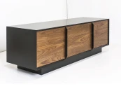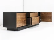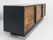 Строгая форма, сочетание гладкой эмали и древесной текстуры, графичные ручки в цвет корпуса делают изделие самодостаточным и универсальным предметом современного интерьера. Материалы: корпус - МДФ, полуглянцевая черная эмаль; фасады - МДФ, шпон американского ореха, бесцветное минеральное масло; внутреннее наполнение - ЛДСП. Фурнитура - направляющие скрытого типа с доводчиками и петли с механизмом tip-on. Возможен выбор других типов отделки, варианты представлены на последнем фото.