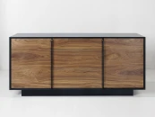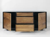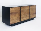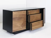 Строгая форма, сочетание гладкой эмали и древесной текстуры, графичные ручки в цвет корпуса делают изделие самодостаточным и универсальным предметом современного интерьера. Материалы: корпус - МДФ, полуглянцевая черная эмаль; фасады - МДФ, шпон американского ореха, бесцветное минеральное масло; внутреннее наполнение - ЛДСП. Фурнитура - направляющие скрытого типа с доводчиками и петли с механизмом tip-on. Возможен выбор других типов отделки, варианты представлены на последнем фото.