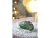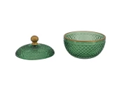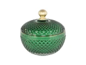 Стеклянная конфетница с крышкой, геометрической текстурой и гранями, отражающими световые потоки. Может служить декоративным элементом, а также удобным местом хранения для продуктов или других мелких предметов.