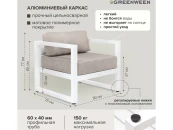 Габариты кресла с подушками 800х755х770 мм, габариты каркаса 800х755х665 мм. Каркас изготовлен из алюминия с толщиной стенок 3 мм. 2 подушки пепельно-коричневого оттенка, размеры 665х700х150 и 665х190х300 мм. съёмные внешние чехлы из мебельной рогожки, 100% полиэстер. Набивка большей подушки поролон, подушка для спины набита синтепоном, обе упакованы в несъёмный чехол из спанбонда. Регулируемые ножки с пластиковым основанием. Высота от пола до сидения (металл) 320 мм. Максимальная нагрузка на кресло 150 кг.