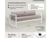 Характеристики: Габариты дивана с подушками 1900х755х770 мм. Габариты каркаса 1900х755х665 мм. Каркас выполнен из алюминия с толщиной стенок 3 мм. 4 подушки в съёмных чехлах на молнии. чехлы сшиты из мебельной рогожки, 100% полиэстер. Размеры подушек 890х710x150 мм и 890х190х300 мм. Набивка большей подушки поролон, подушка для спины набита синтепоном, упакованы в несъёмный чехол из спанбонда. Регулируемые ножки с пластиковым основанием. Высота от пола до сидения (металл) 320 мм. Высота от пола до подушки 470 мм. Вес алюминиевого каркаса 23, 5 кг, подушки весят по 2, 6 и 3, 1 кг пара. Максимальная нагрузка на диван 250 кг.