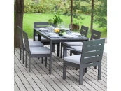 В уличном наборе KORFU представлены большой обеденный стол и 6 стульев с подушками, в комплекте 2 стула с подлокотниками, 4 стула без подлокотников. Каркас мебели изготовлен из высокопрочного алюминия с полимерным покрытием в оттенке LAVA.