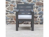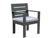 Уличный стул с подлокотниками KORFU отличается современным дизайном и долговечностью. Каркас изготовлен из высокопрочного алюминия с полимерным покрытием в оттенке LAVA. Для комфортной посадки в комплекте идет подушка в съемном чехле из мебельной рогожки светло-серого оттенка.
