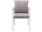 Уличный стул из коллекции мебели SANTORINI привлекает внимание элегантным дизайном и долговечностью. Обеденный стул изготовлен из высокопрочного алюминия белого цвета. Легкий каркас дополняют деревянные подлокотники из лиственницы, для комфортной посадки в комплекте идут 2 удобные подушки в съемных чехлах из мебельной рогожки пепельно-коричневого оттенка.