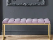 Банкетка ALBA с золотым основанием и мягкой велюровой подушкой с каретной стяжкой.