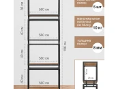 Каркас стеллажа изготовлен из стальной профильной трубы 20х20 с полимерным покрытием. Полки выполнены из ЛДСП толщиной 8 мм, выдерживают нагрузку до 10 кг.