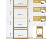 Каркас стеллажа изготовлен из стальной профильной трубы 20х20 с полимерным покрытием. Полки выполнены из ЛДСП толщиной 8 мм, выдерживают нагрузку до 10 кг.