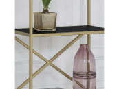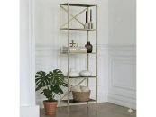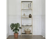 Вместительный стеллаж KARIN создает уникальный дизайн и зонирует помещение. Утонченное сочетание золотого каркаса и полок с рисунком дерева позволит разместить стеллаж в любом интерьере.