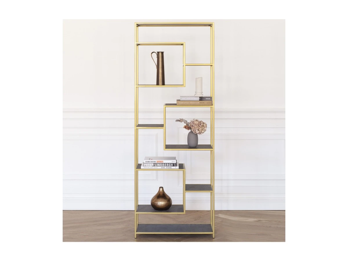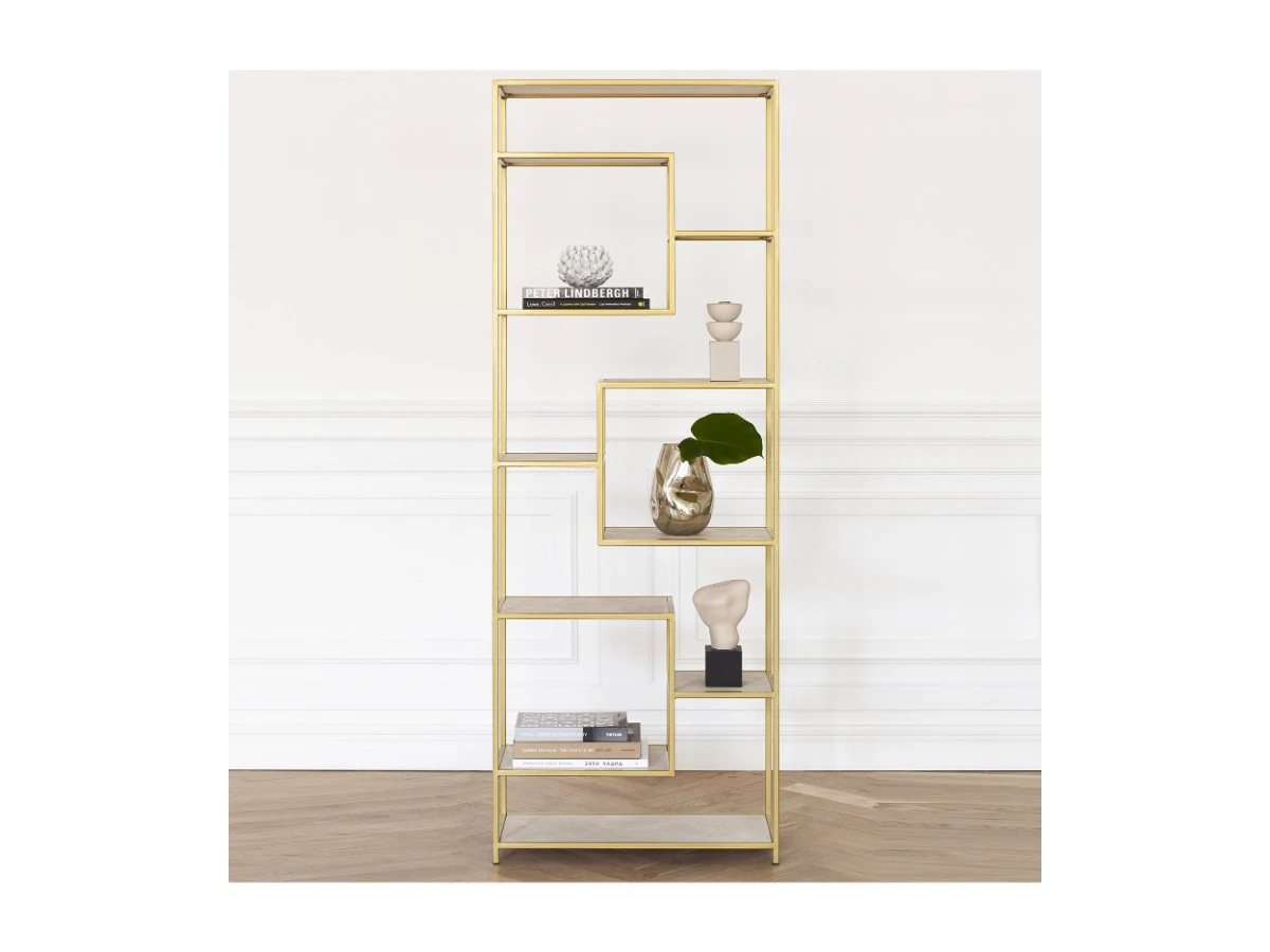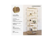 Золотой металлический стеллаж OLIVIA с полками из ЛДСП привлекает внимание элегантным дизайном и функциональностью. Стальной каркас обеспечивает прочность и надежность предмета интерьера.