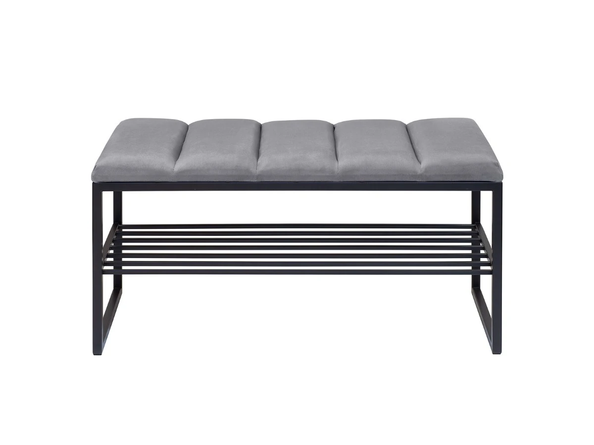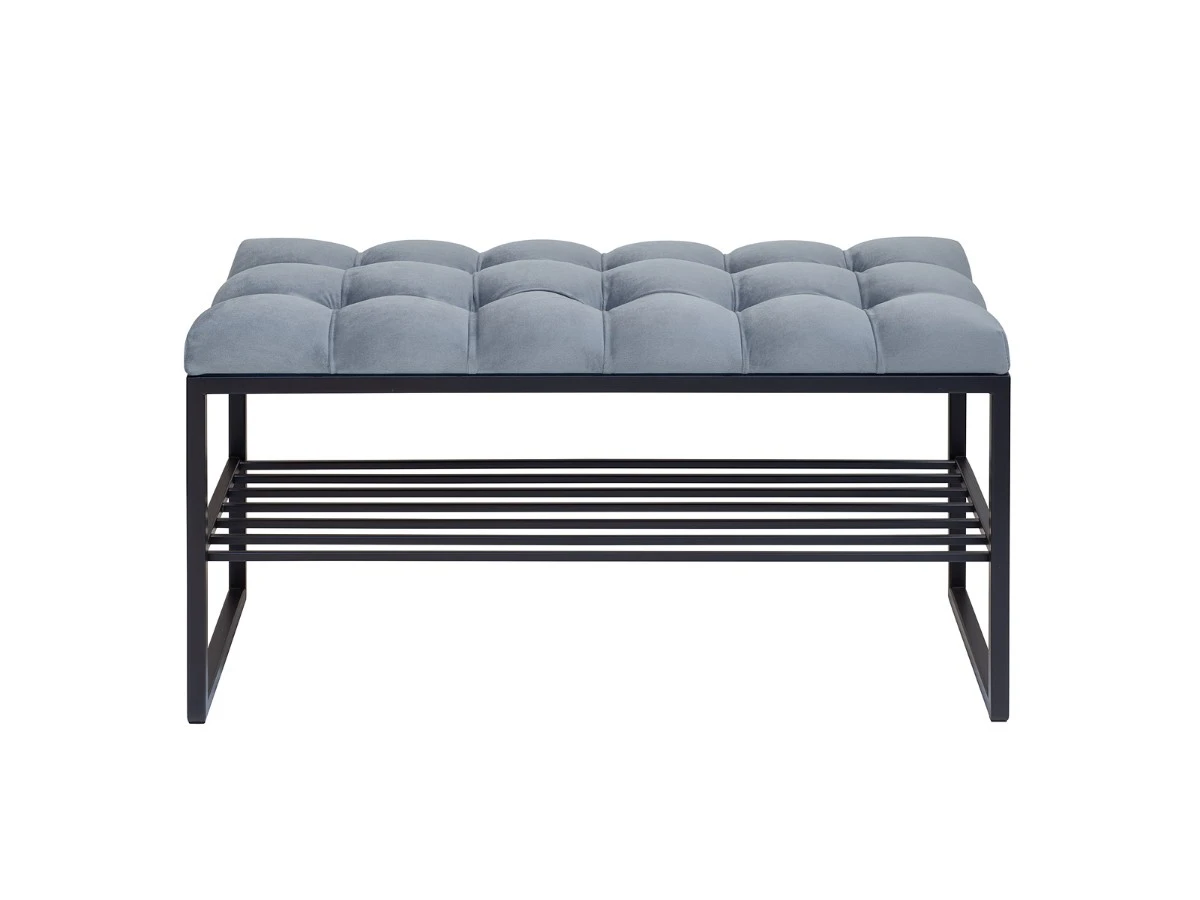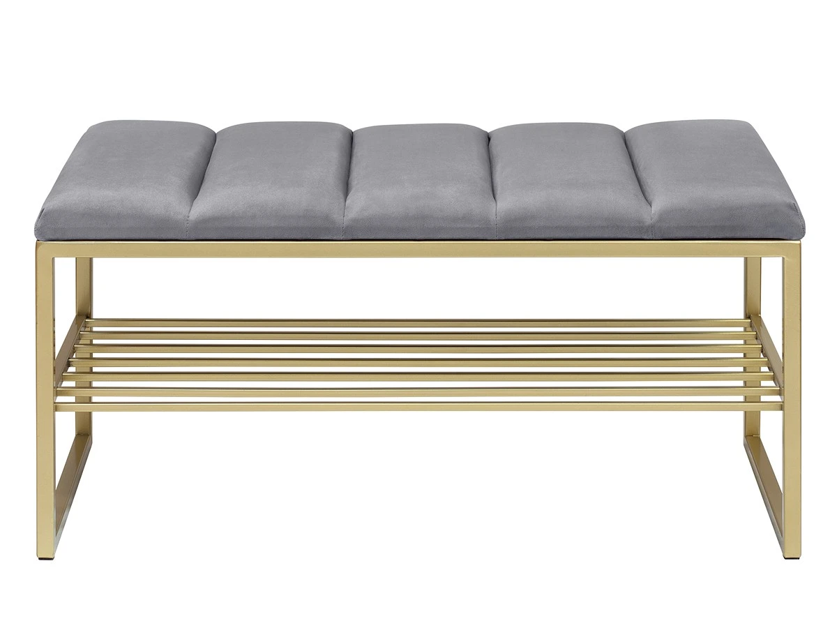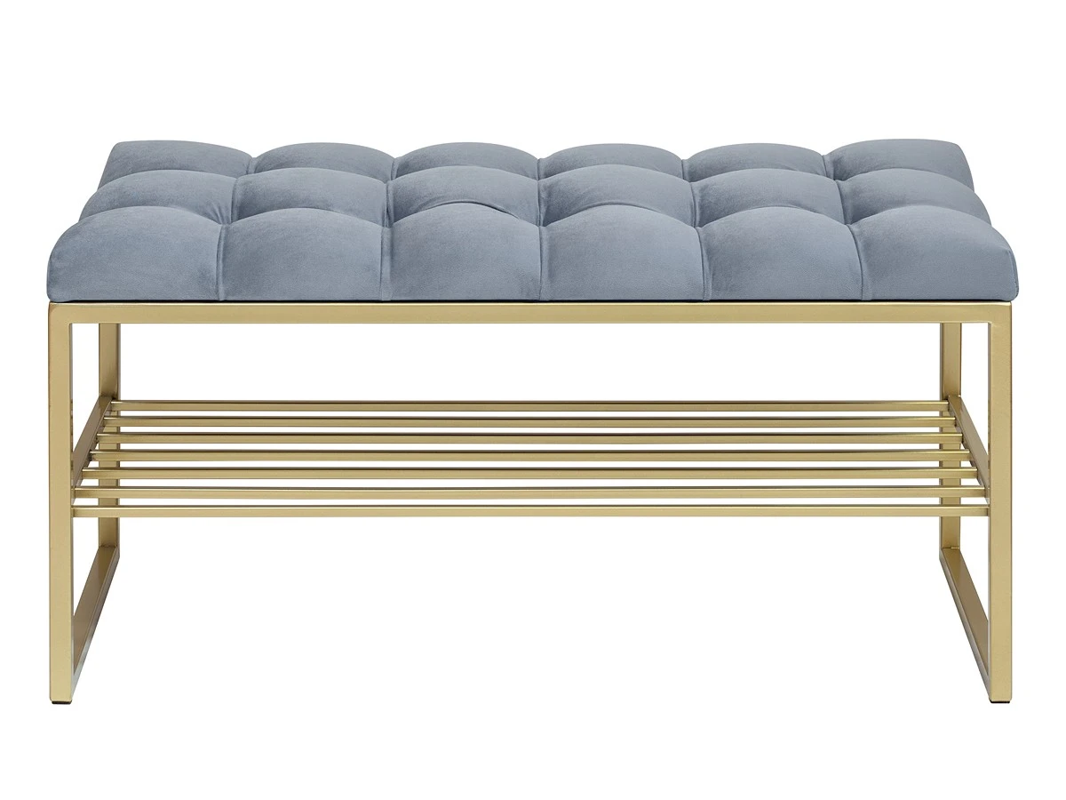 Банкетка RUBY с золотым основанием, полкой для обуви и мягкой велюровой подушкой с каретной стяжкой.