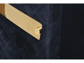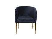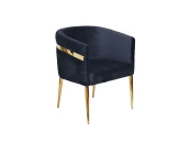Роскошный стул из темно-синего велюра украсит вашу гостиную или столовую. Мягкая спинка, переходящая в подлокотники, простегана с внешней стороны и декорирована эффектной накладкой из золотистой полированной стали. Тонкие изящные ножки цвета золота гармонично сочетаются с обивкой. Мягкая мебель с металлическим декором - модный тренд, который используют ведущие дизайнеры интерьеров во всем мире. Размер сиденья: Ш67*Г53см, высота от пола 50см