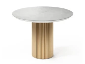 Подстолье диаметром 385 мм изготовлено из МДФ с покрытием эмалью золотого цвета. При раскладывании стола подстолье делится на два полукруга.