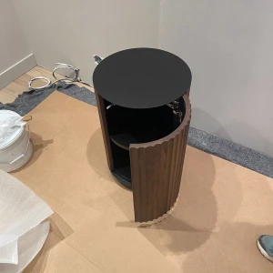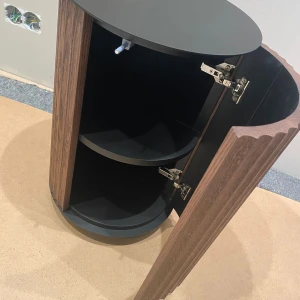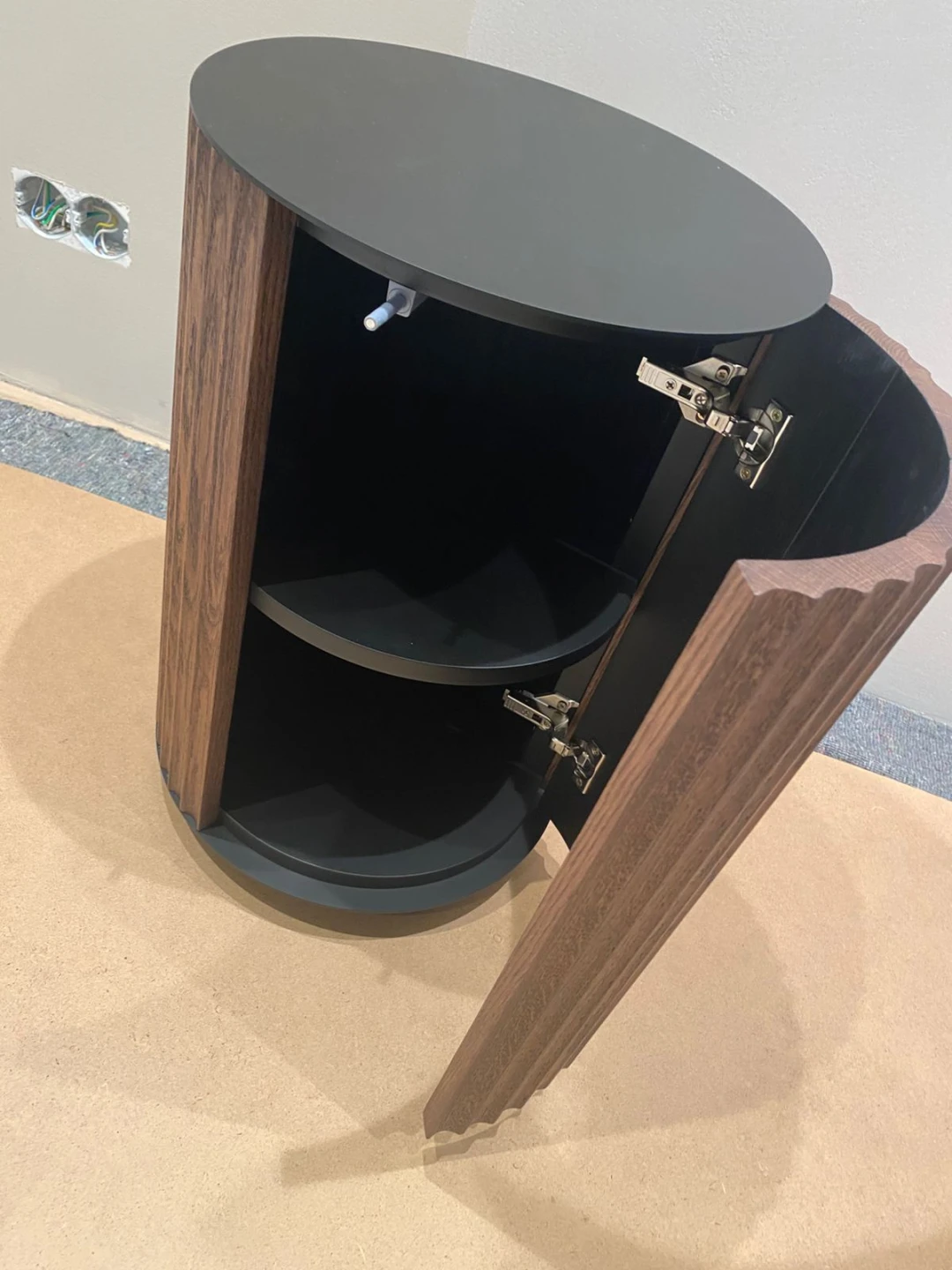 Тумба выполнена из МДФ и покрыта натуральным шпоном дуба в коричневой тонировке с двумя слоями защитного матового лака. Столешница и цоколь покрыты черной эмалью.