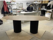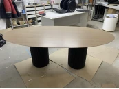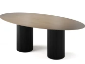 Овальная столешница выполнена из МДФ со скошенной кромкой. Это позволяет придать столу визуальную лёгкость, но при этом не потерять высокие показатели прочности столешницы. В качестве материала отделки используется натуральный шпон дуба.