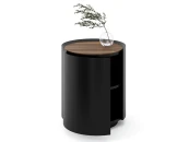 Тумба выполнена из МДФ и покрыта чёрной эмалью с двумя слоями защитного матового лака. В качестве материала отделки столешницы и внутренних полок используется натуральный шпон американского ореха.