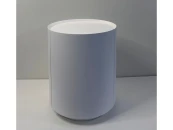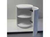 её уникальность заключается в монолитном виде, который достигается за счёт гладкой поверхности и отсутствия ручки на распашном фасаде. Благодаря петлям с доводчиком обеспечивается плавное бесшумное закрывание тумбы.