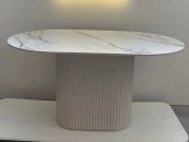 Столешница выполнена из МДФ со скошенной кромкой. Это позволяет придать столу визуальную лёгкость, но при этом не потерять высокие показатели прочности столешницы. В качестве материала отделки используется керамогранит c текстурой белого мрамора, который придаёт изделию высокую устойчивость даже к самым активным действиям на его поверхности, что обеспечивает долгие годы его эксплуатации для Вас.