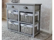 Комод с четырьмя плетеными корзинами и двумя ящиками. Каркас комода, верхняя панель и ящики выполнены из дерева. Плетеные корзины из лозы. Чехлы на корзинах съемные. Классический плетеный комод в современном исполнении украсит ваш интерьер и поможет организовать хранение мелочей. Цвет - серый со стильными искусственными потертостями.