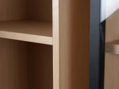 В дизайне выражена доминанта прямых форм, лаконичных линий и элегантного исполнения. Скрытые механизмы открытия дверей, естественная древесная текстура, светлые оттенки, рифление на фасадах дают интерьеру ощущение размеренности, сбалансированности, упорядоченности. Фасады без ручек поддерживают идею отказа от визуального шума, двери открываются по принципу «нажал-открыл».