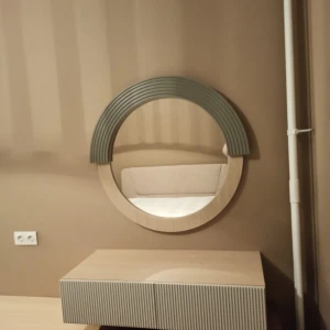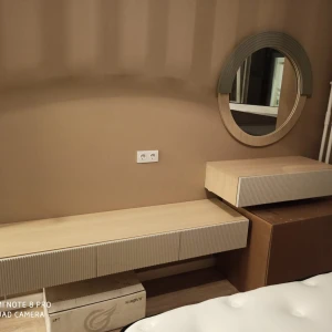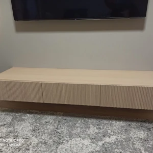 В дизайне выражена доминанта прямых форм, лаконичных линий и элегантного исполнения. Скрытые механизмы открытия дверей, естественная древесная текстура, светлые оттенки, рифление на фасадах дают интерьеру ощущение размеренности, сбалансированности, упорядоченности. Фасады без ручек поддерживают идею отказа от визуального шума, двери открываются по принципу «нажал-открыл».