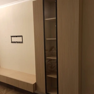 В дизайне выражена доминанта прямых форм, лаконичных линий и элегантного исполнения. Скрытые механизмы открытия дверей, естественная древесная текстура, светлые оттенки, рифление на фасадах дают интерьеру ощущение размеренности, сбалансированности, упорядоченности. Фасады без ручек поддерживают идею отказа от визуального шума, двери открываются по принципу «нажал-открыл».