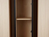 В дизайне выражена доминанта прямых форм, лаконичных линий и элегантного исполнения. Скрытые механизмы открытия дверей, естественная древесная текстура, светлые оттенки, рифление на фасадах дают интерьеру ощущение размеренности, сбалансированности, упорядоченности. Фасады без ручек поддерживают идею отказа от визуального шума, двери открываются по принципу «нажал-открыл».