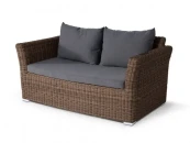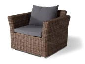 Высококачественный и неприхотливый искусственный ротанг темно-коричневого оттенка. Прочный алюминиевый каркас, выдерживающий до 200 кг. Подушки выполнены из водостойкой полиэфирной ткани для защиты мебели от дождя и солнца. Съемные чехлы серого цвета. Алюминиевое основание ножек. Столешница журнального столика изготовлена из крепкого закалёного стекла толщиной 5 мм. Вся мебель сделана вручную нашими квалифицированными специалистами. В комплект лаунж зоны входит один двухместный диван, два кресла, журнальный столик и подушки.