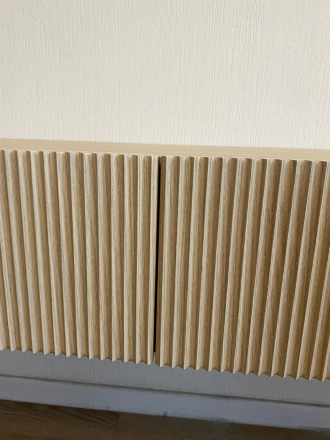 В дизайне выражена доминанта прямых форм, лаконичных линий и элегантного исполнения. Скрытые механизмы открытия дверей, естественная древесная текстура, светлые оттенки, рифление на фасадах дают интерьеру ощущение размеренности, сбалансированности, упорядоченности. Фасады без ручек поддерживают идею отказа от визуального шума, двери открываются по принципу «нажал-открыл».