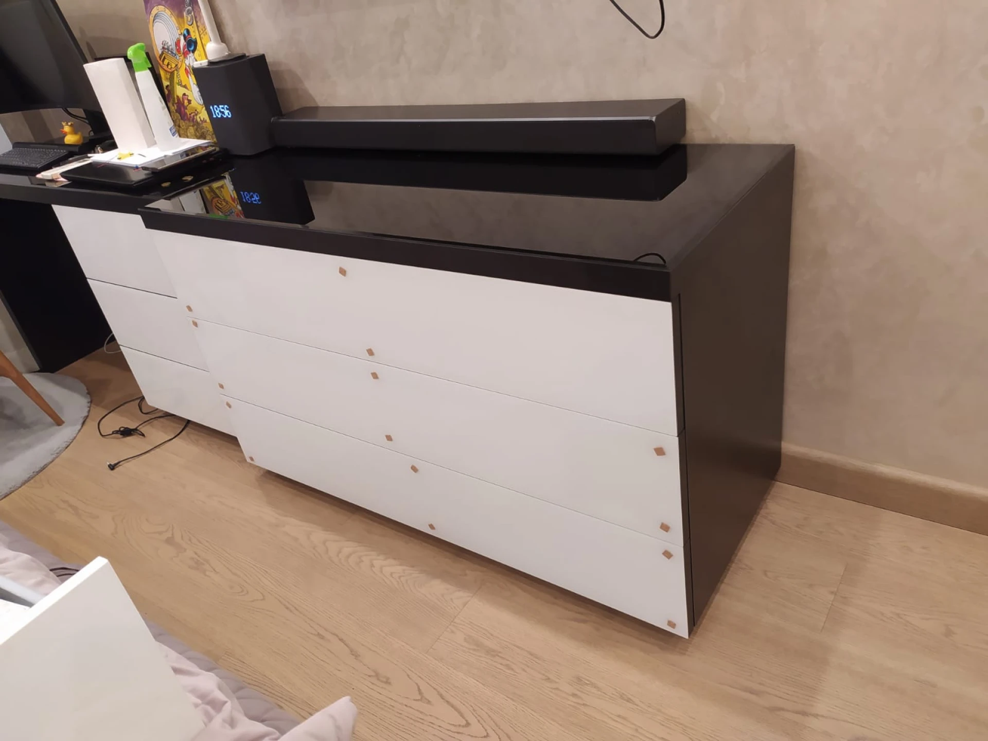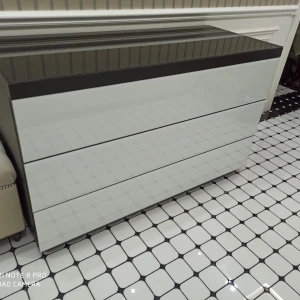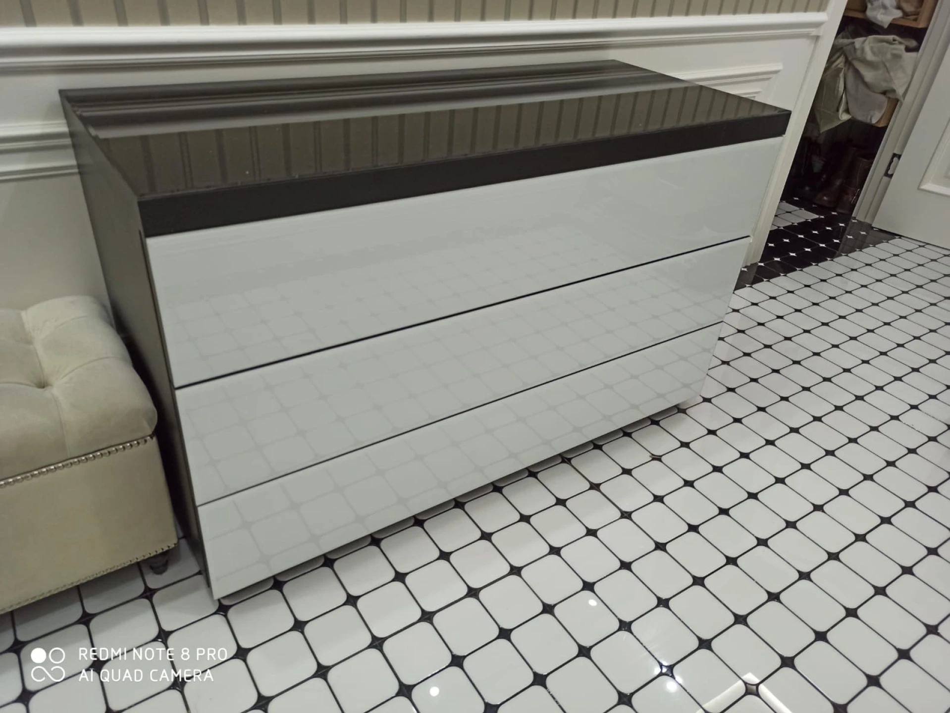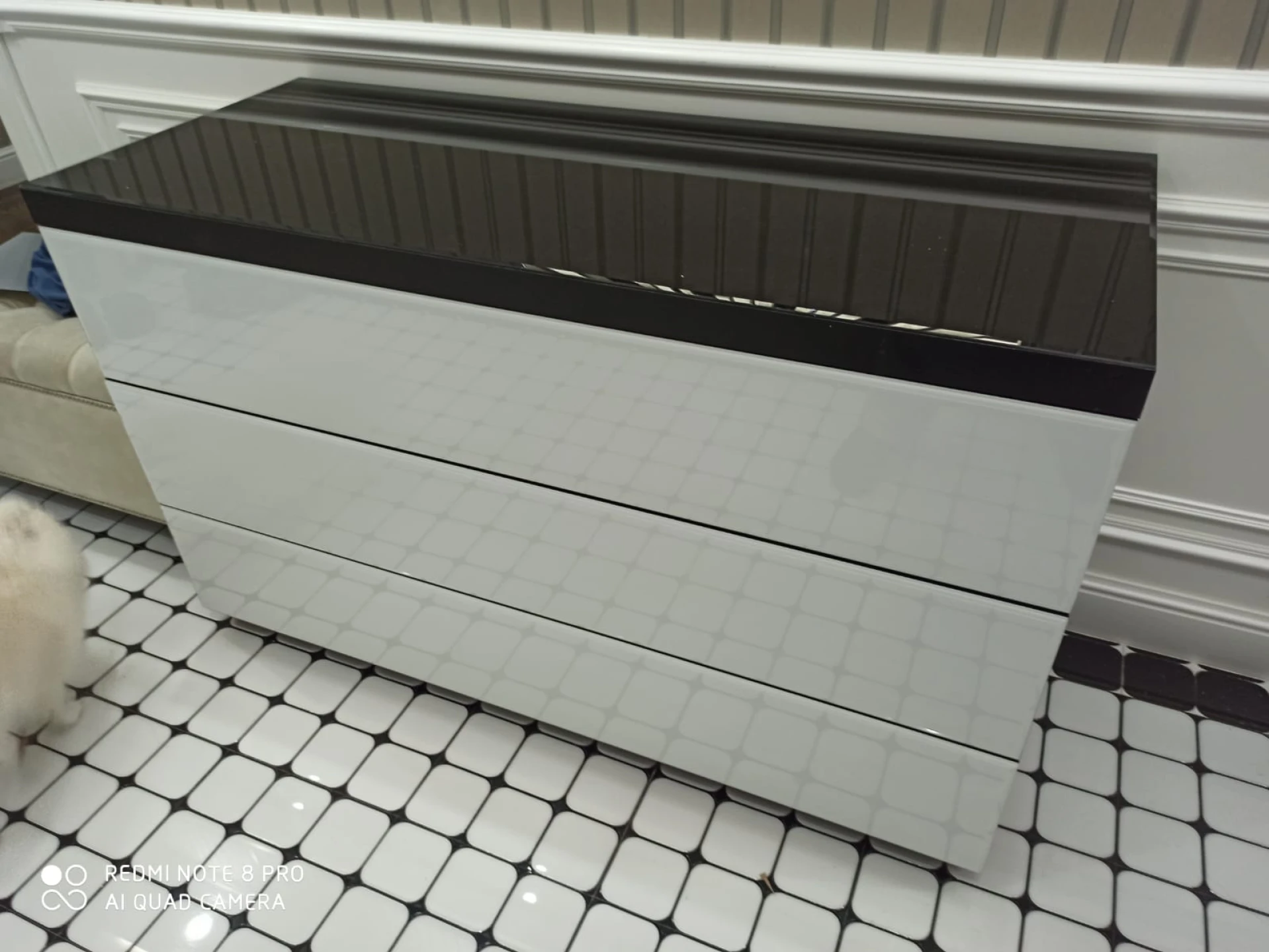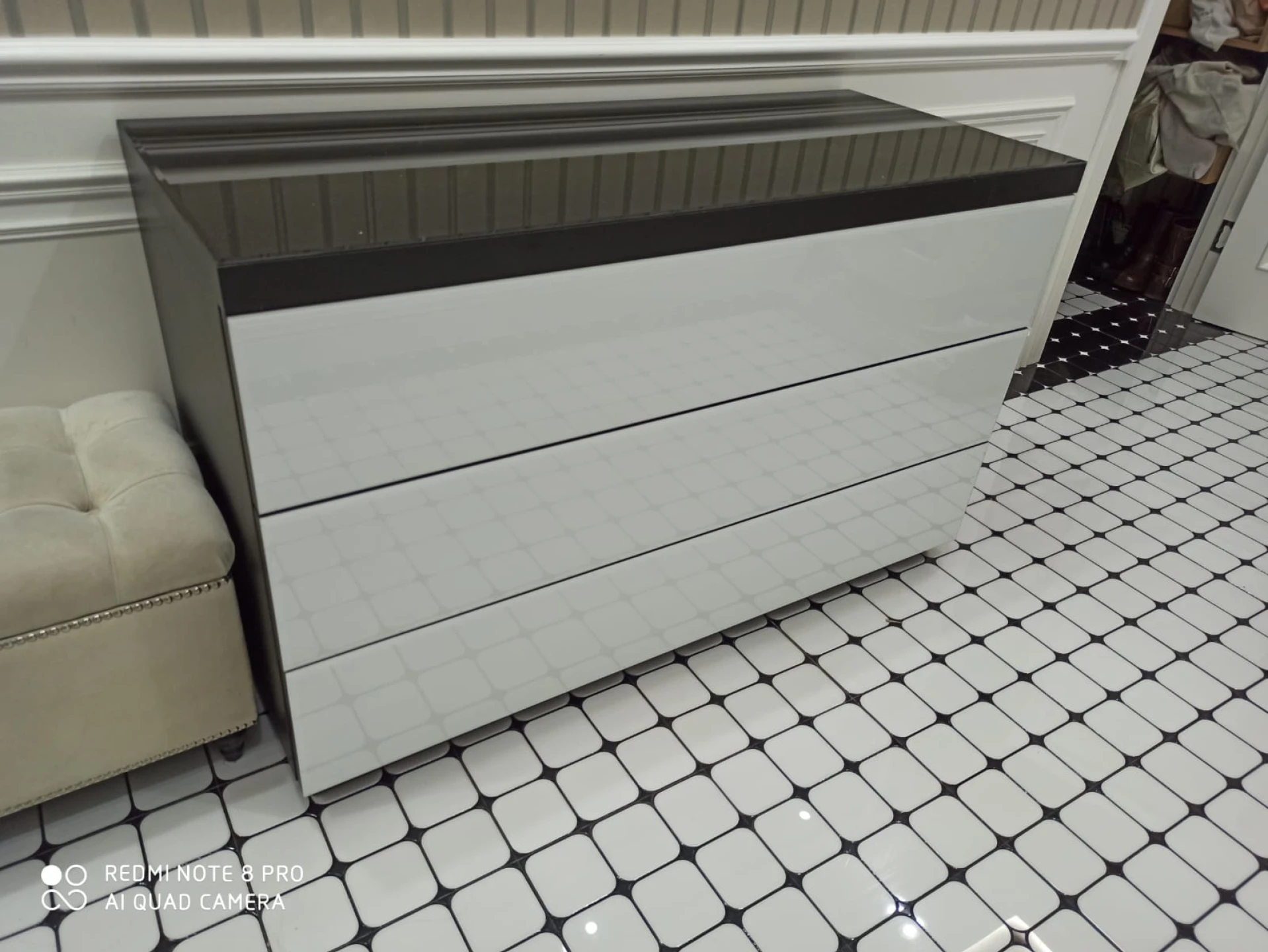 Комод с 3 выдвижными ящиками, открывающимися по принципу «нажал-открыл». Фасады ящиков и верхняя поверхность комода декорированы стеклом.|Комод рекомендуется крепить к стене.