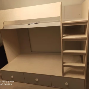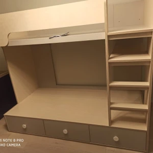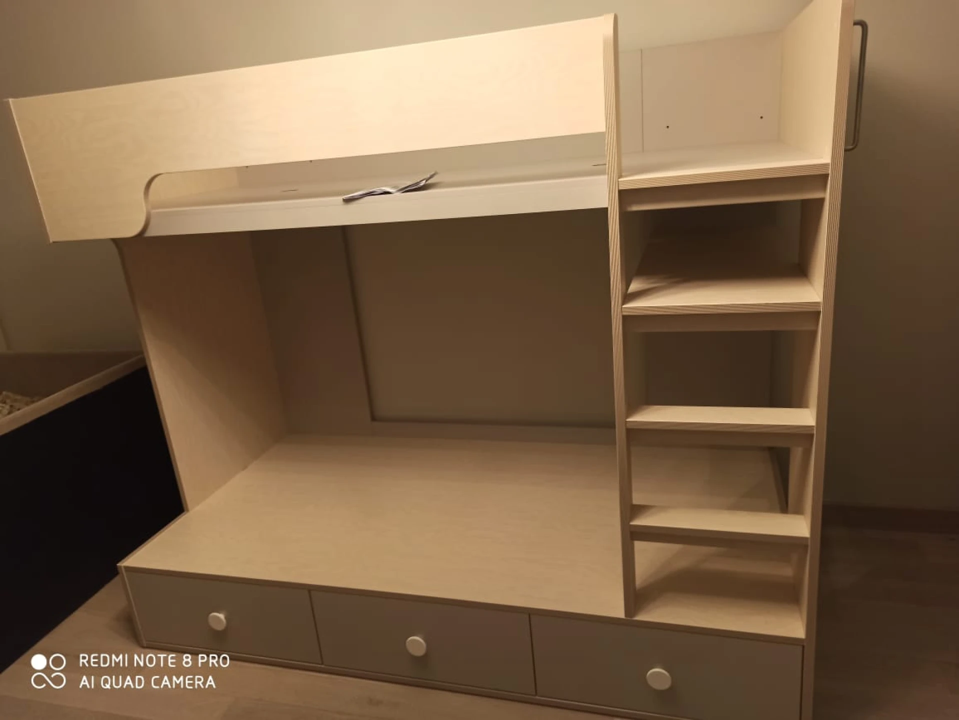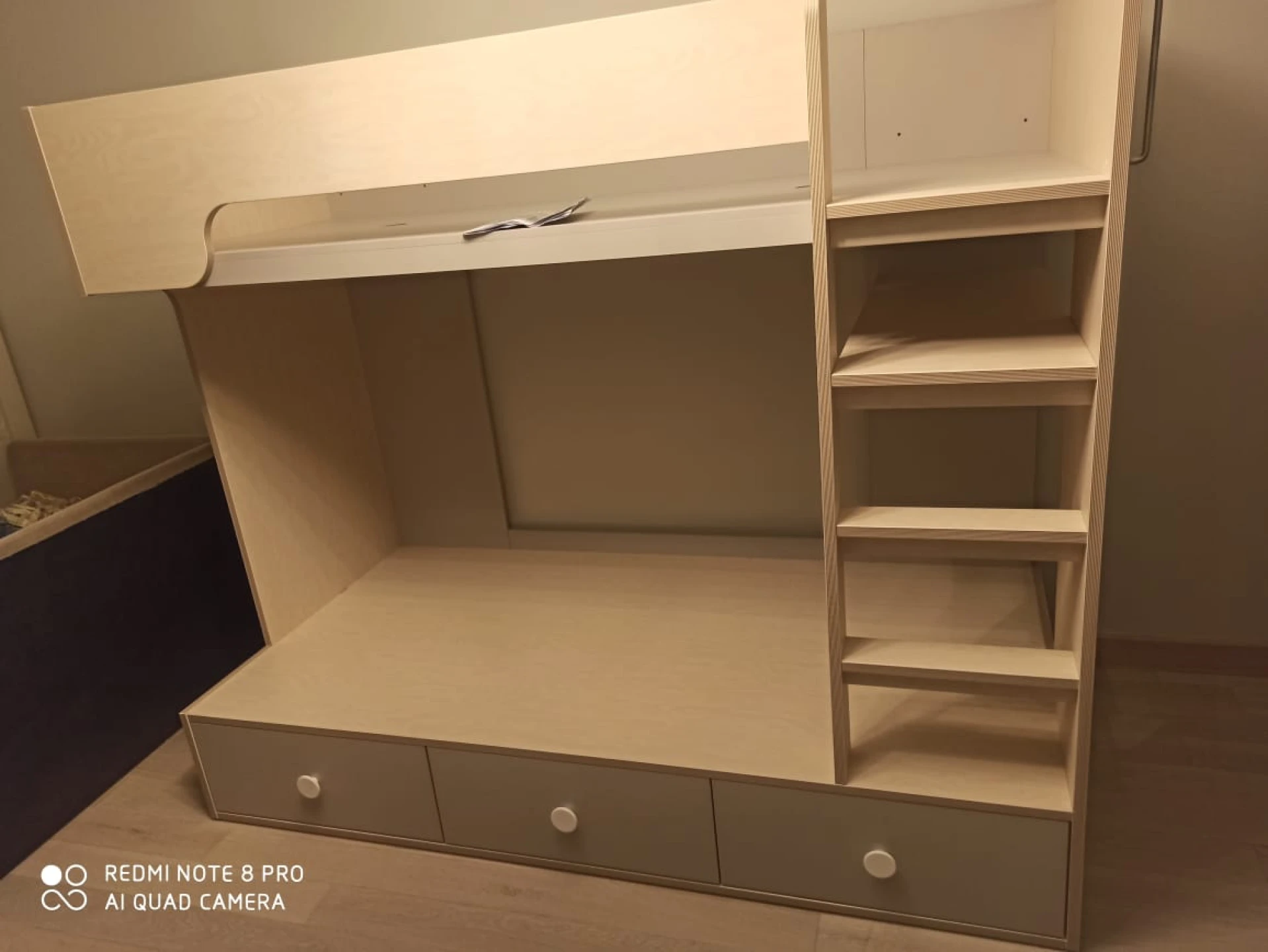 Двухъярусная кровать. Верхний и нижний ярус имеет щитовое основание, верхнее установлено на брусках. Нижний ярус снабжен тремя выдвижными ящиками на роликовых направляющих, дно ящика выполнено из ЛДСтП. Имеется стационарная лестница, одна из ступеней является полкой. В верхней части установлена металлическая ручка-скоба для удобства пользования лестницей. Спальное место обоих ярусов 2000х900мм. Высота ограждения верхнего яруса – 320мм. Высота матраца для верхнего яруса не должна превышать 160мм.