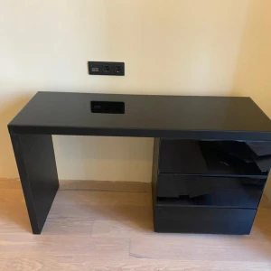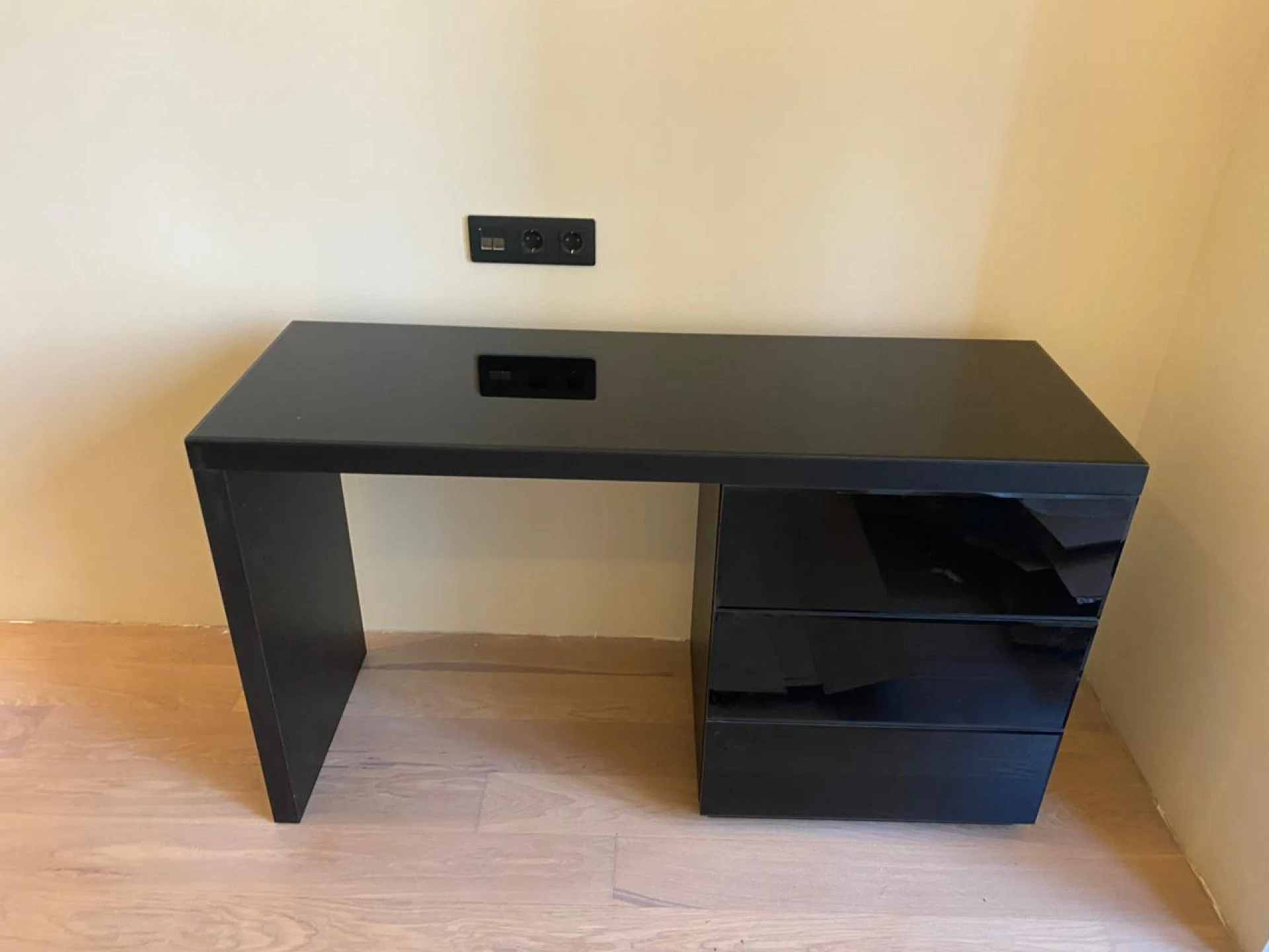 Туалетный столик с тремя выдвижными ящиками. Столешница и фасадные стенки ящиков декорированы стеклом. Стол может быть собран с правым или левым расположением тумбы с ящиками. Ящики открываются по принципу «нажал — открыл».