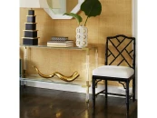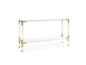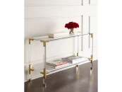 Выразительная консоль Саратога выполнена из стекла. Лаконичная прямоугольная столешница опирается на тонкие ножки, будто слегка касается ее. Нижняя часть конструкции дополнена удобной полкой. В качестве элементов декора выступают золотистые металлические накладки, украшающие углы и соединения. Дизайн смотрится легко и утонченно, благодаря комбинации стекла и металла.