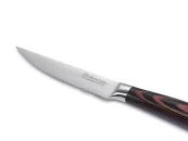 - Рукоятки ножей изготовлены из композита Pakka wood, который получают путем смешивания и последующего прессования под высоким давлением слоев древесного шпона со смолами и красителями. Процесс стабилизации обеспечивает готовому материалу высокую прочность, водонепроницаемость, устойчивость к механическом повреждениям и температурным воздействиям.