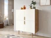 Коллекция в скандинавском стиле LINE изготавливается: корпус лдсп, фасады - мдф фрезерованные под краской с золотой патиной, ручки - состаренное золото, ножки - массив березы под морилкой.